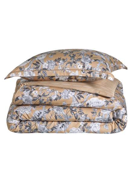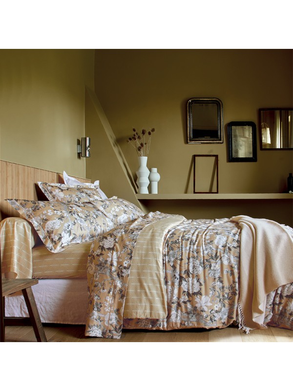 Avec la parure Impérial chanvre par Blanc des Vosges en satin de coton imprimé, retrouvez l'esprit intemporel des jardins anglais, modernisés par une coloration contemporaine. Sur un fond chanvre se déploient pivoines, branchages et papillons, traités dans un monochrome gris et noir ultra moderne. Ce caractère est renforcé par le motif coordonné délicatement orné de palmiers d'esprit art-déco.