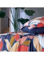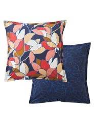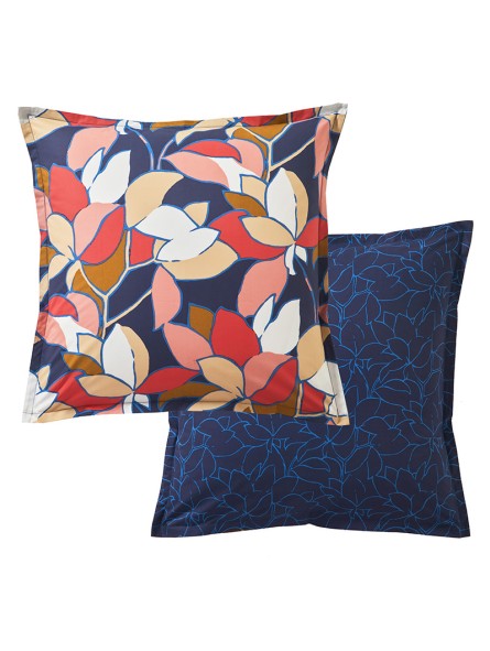 La parure de drap Utopia par Blanc des Vosges célèbre la beauté des formes et des couleurs, à travers un motif floral traité par un à plat de couleurs audacieuses. Le traversin et l'envers des taies d'oreiller reprennent le même motif par une filigrane contrastée sur un fond bleu cobalt tonique et moderne.