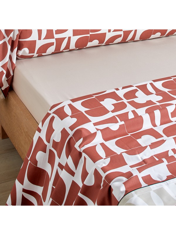Elle existe en 2 variantes bleu paon et terracotta et se compose d'un drap plat, un traversin, 2 taies d'oreiller carrées et un drap housse.
