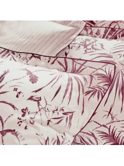 La taie d'oreiller Serre tropicale par Anne de Solène, revisite l'imprimé tropical dans une coloration lie de vin sur un fond blanc lumineux. Les palmes exubérantes du tissu principal se coordonnent avec une rayure pointillée du plus bel effet. Le support en percale de coton Bio et les finitions raffinées en font un produit intemporel et inusable.