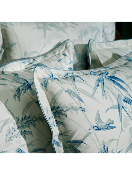 La parure de couette Estampe par Anne de Solène, s'illustre de perruches délicates et de bambous graciles qui semblent flotter au vent, dans un camaïeu reposant de gris bleutés. Le support en percale de coton Bio et les finitions raffinées en font un produit intemporel et inusable.