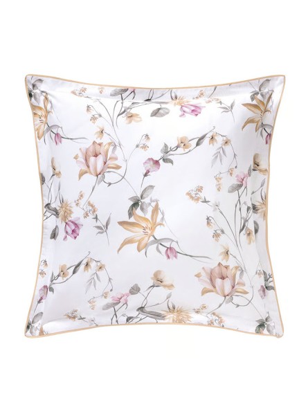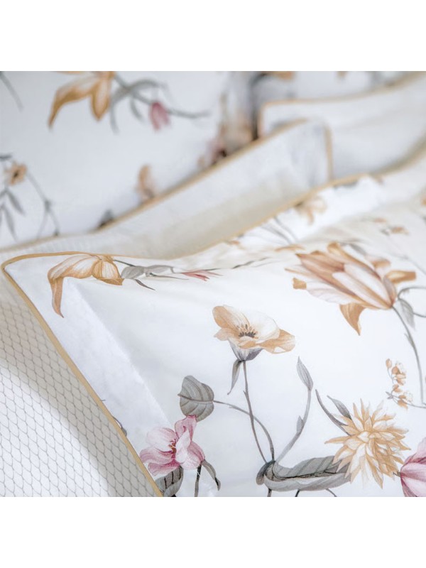 La taie d'oreiller Perle lune par Anne de Solène, s'inscrit dans la style floral traditionnel de la marque avec cet entrelacs de fleurs délicatement dessinées. Dans une harmonie de miel, rose et vert tendre, les volutes fleuries se déploient sur un fond blanc, coordonné avec un discret motif géométrique, comme un fin grillage. Le support en percale de coton Bio et les finitions raffinées en font un produit intemporel et inusable.