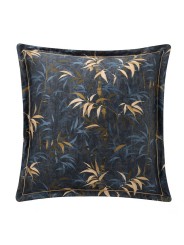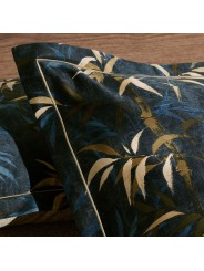 Avec la taie d'oreiller Contemplation par Anne de Solène, le motif bambou se pare de coloris nocturnes et dorés, dans une ambiance végétale mystérieuse. Sur un fond bleu nuit, les feuillages graciles se déclinent en tons bleus plus clairs, illuminés de touches dorées. Le motif coordonné de palmette marine sur fond beige, adoucit ce modèle résolument décoratif en satin de coton doux et brillant.