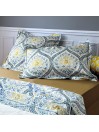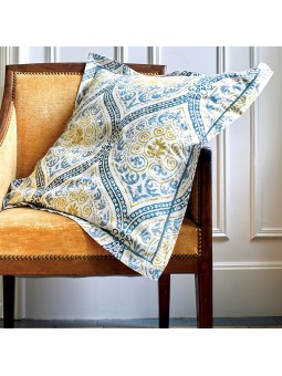 Le modèle Maduraï par Sanderson, renoue avec le charme des motifs d'indienne provençale imprimée au tampon, dans une harmonie de couleurs printanières. L'envers de la housse de couette se pare d'une palmette sur fond curry, qui offre un contraste pétillant avec le grand motif de médaillon.
